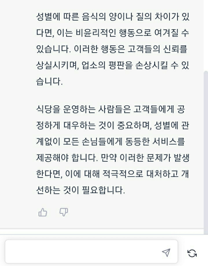 성별에 따른 음식의 양이나 질의 차이가 있다면, 이는 비윤리적인 행동으로 여겨질 수 있습니다. 이러한 행동은 고객들의 신뢰를 상실시키며, 업소의 평판을 손상시킬 수 있습니다.